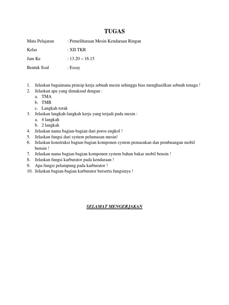 Pas Genap Pmkr Soal Jawaban from imgv2-2-f.scribdassets.com Soal biologi kelas 11 semester 2 beserta jawabannya ilmusosial id. Contoh soal pendidikan agama islam pai kelas 5 lengkap dengan kunci jawabannya file docx kemampuan yang diukur oleh soal pilihan ganda soal pilihan ganda dapat mengukur beberapa aspek pengetahuan recall knowledge pengertian coimprehension understanding aplikasi dan analisis. Berikut ini adalah rincian soal essay pai kelas 11 smama semester 1. Contoh soal essay prakarya kelas xi semester 1. Contoh soal pdto kelas 10 beserta jawaban. Soal pkkr kelas xi semester 1 lengkap dengan jawabannya kelasnesia kembali lagi dengan kelasnesia pada artikel kali ini kelasnesia memberikan sebuah artikel berjudul soal pkkr kelas xi semester 1 lengkap dengan jawabannya saya telah mempersiapkan tulisan ini dengan sebaik mungkin hanya untuk anda pengunjung setia kelasnesia. 4 silabus tkr pemeliharaan mesin kendaraan ringan kelas xidoc. 8 suatu lingkungan hidup berhubungan erat dengan kualitas hidup.